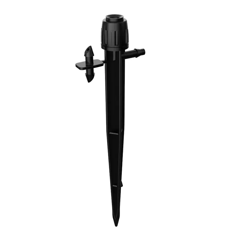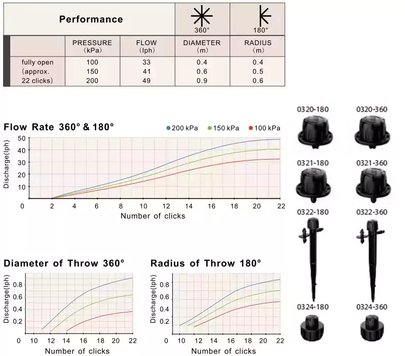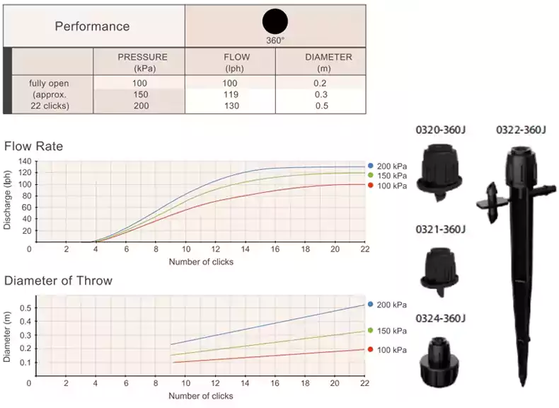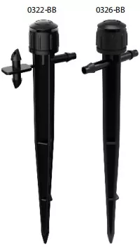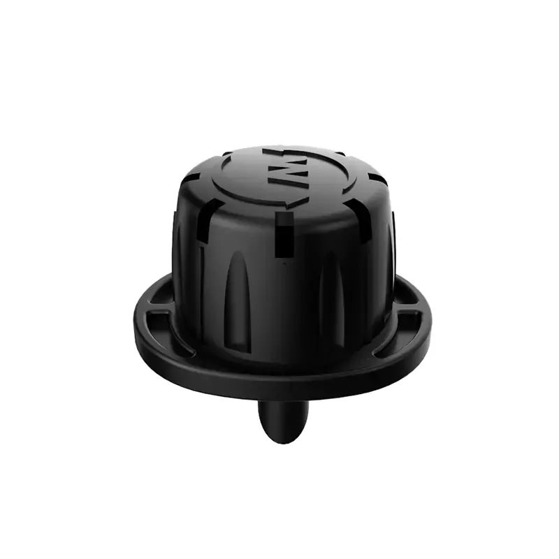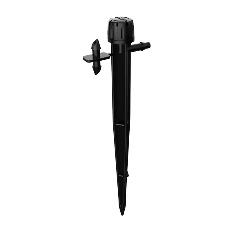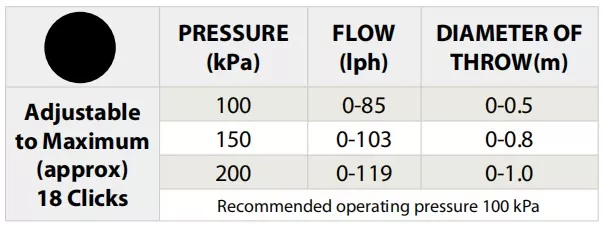 Die Drehung der Mini-Bubbla-Kappe ermöglicht die gleichzeitige Einstellung der Durchflussmenge und des Wurfdurchmessers. Dieses Twista-Sprühgerät mit einstellbarem Durchfluss erzeugt ein gleichmäßiges Schirmmuster, das sanft Wasser auf den Wurzelbereich der Pflanze aufträgt.