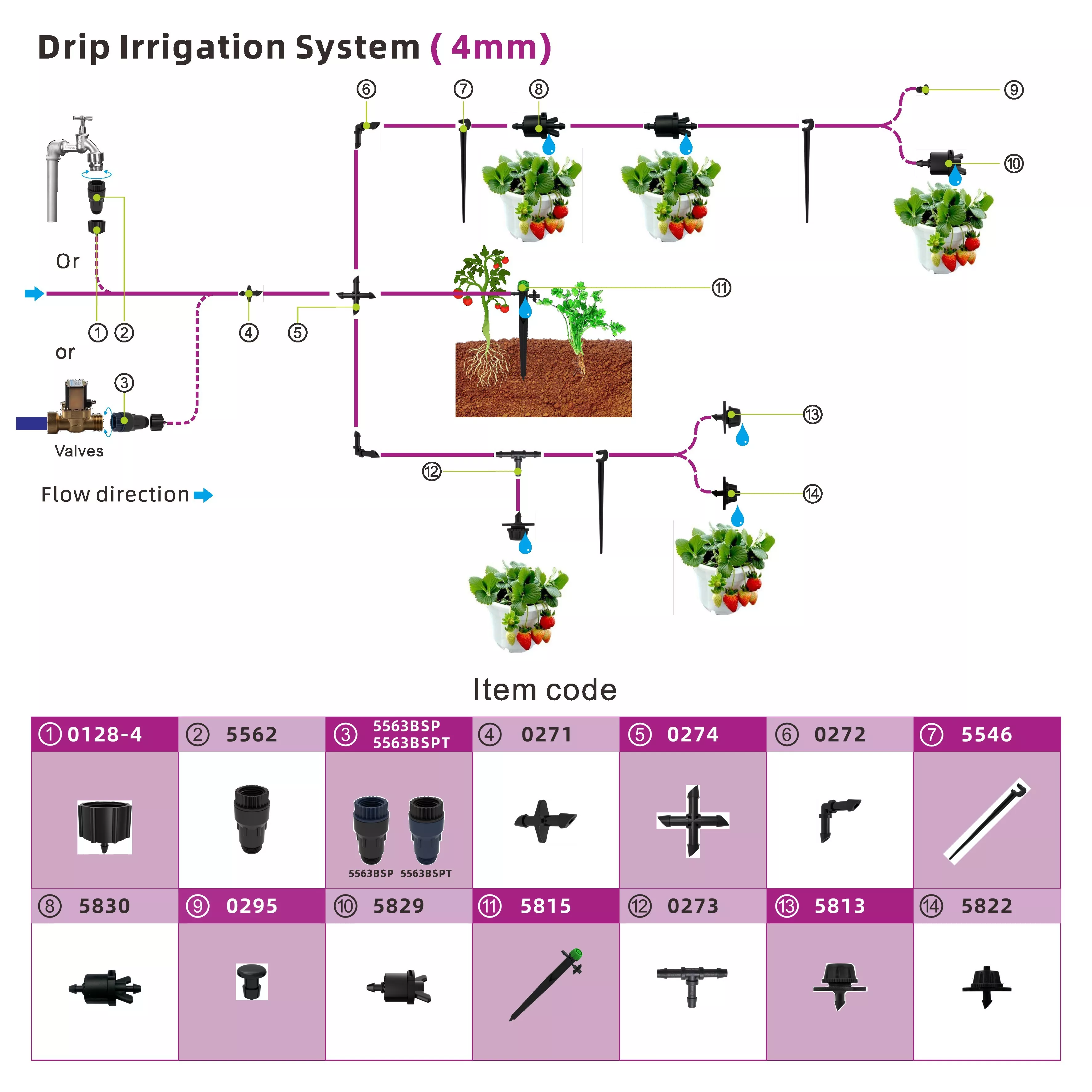 3、PC-Tropferbereich mit Widerhaken: 2 lph, 4 lph und 8 lph mit 4-mm-Auslauf.