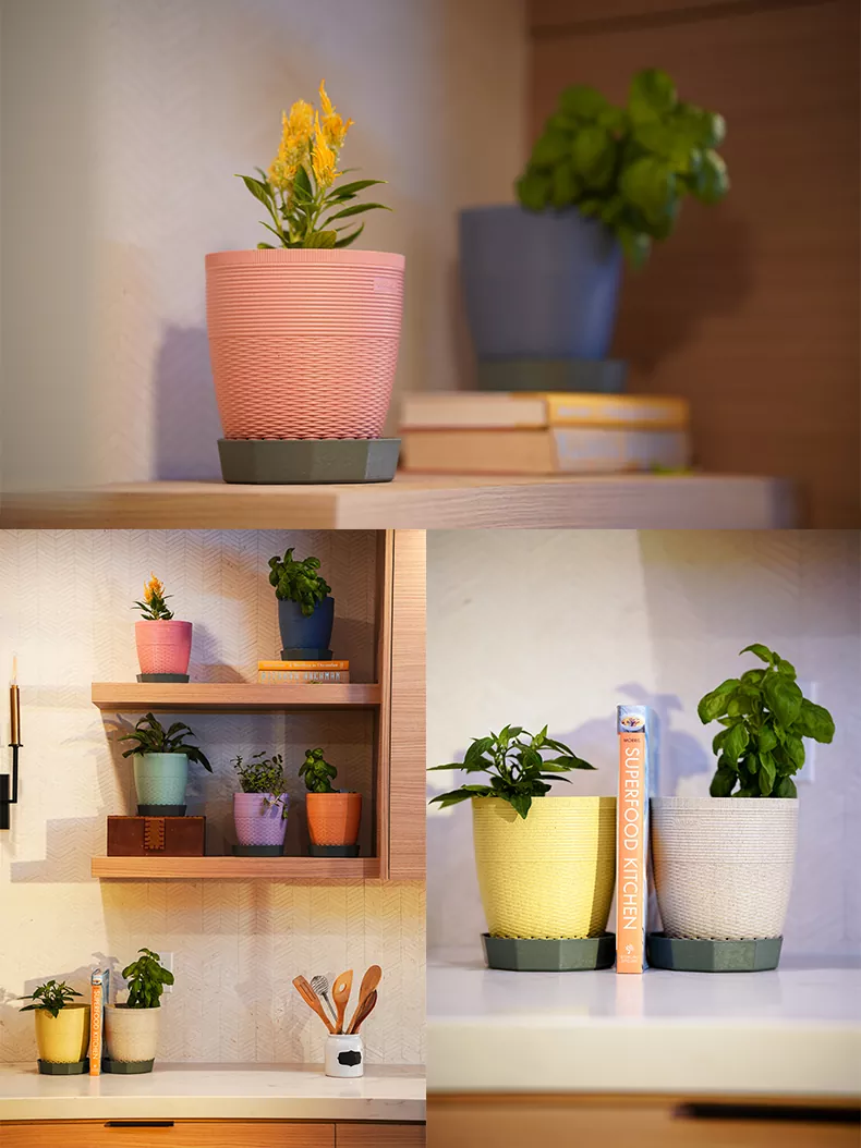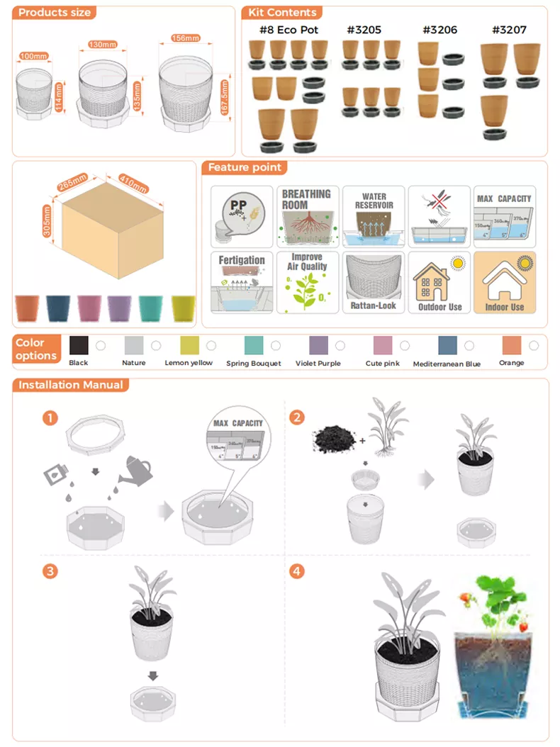 In dieser Serie gibt es drei Blumentöpfe unterschiedlicher Größe. Der 4-Zoll-Blumentopf ist der kleinste, der 5-Zoll-Blumentopf ist mittelgroß und der 6-Zoll-Blumentopf ist der größte. Jeder Blumentopf wird mit einem Wasserspeichersockel geliefert.