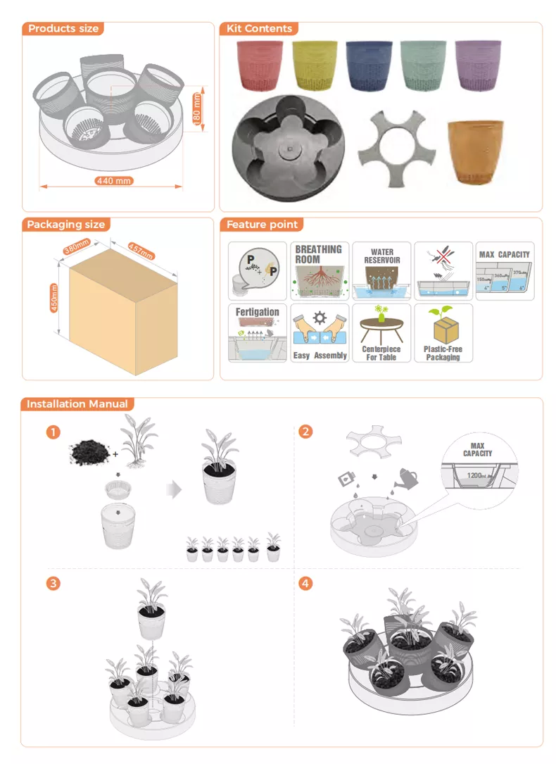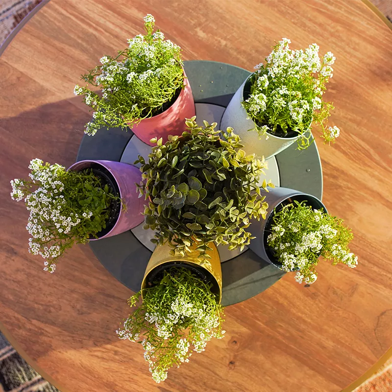 Rundes Tisch-Gartenset mit 6 Weizenstroh-Kunststoffen Pflanzgefäße Inkl.: Fertigation-Sockel x1, 5" Pflanzgefäß x 5, 15,2 cm Pflanzgefäß x 1
