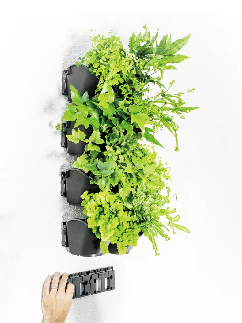 Dieser selbstbewässernde Blumentopf für den Innenbereich kann sowohl mit der vertikalen Wand-Gartenhalterung von Watex als auch mit der mobilen grünen Wand aus Metall von Watex kombiniert werden.