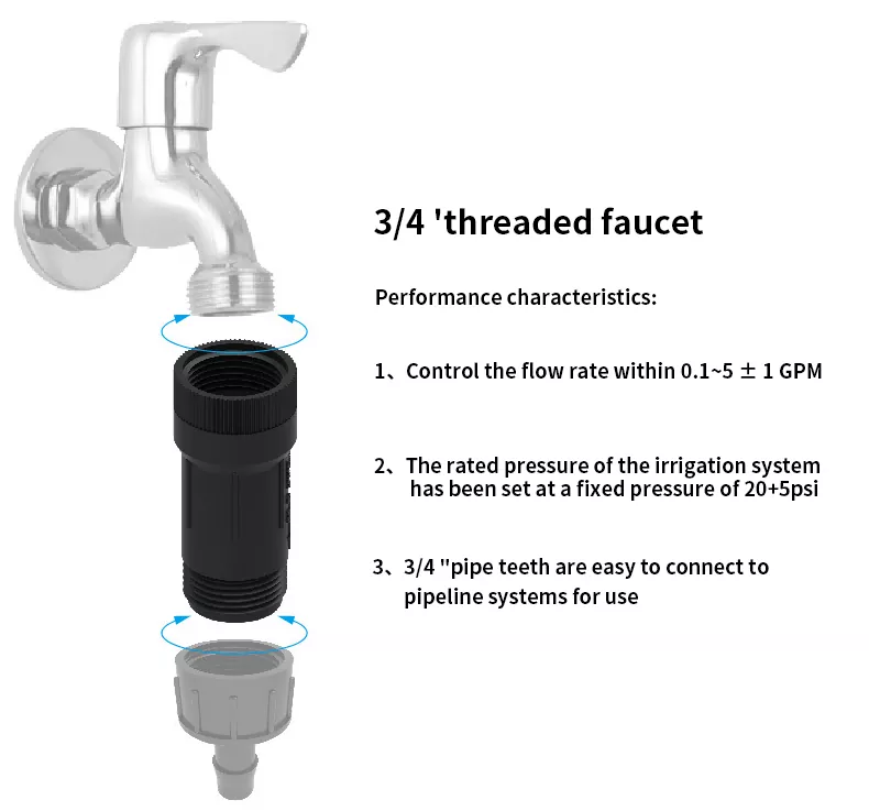 Der Druckregler eignet sich sowohl für 13-mm-/19-mm-/25-mm-Bewässerungssysteme im Innen- als auch im Außenbereich. Seine Hauptfunktion besteht darin, den Wasserdruck und -fluss durch die Regulierung unterschiedlicher Einlassdrücke zu stabilisieren und so eine gleichmäßige Leistung für Endpunkt-Tropfbewässerung, Sprinklersysteme und andere Bewässerungsanwendungen mit geringem Durchfluss sicherzustellen. Es ist mit allen Arten der Tropfbewässerung, Systemen mit geringem Durchfluss und mobilen Sprinklermaschinen kompatibel und eignet sich daher ideal für wassersparende Bewässerungsanlagen.