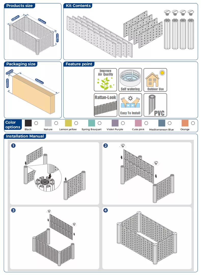 Jedem rechteckigen Gartenbett aus Immolrattan-Kunststoff liegt eine ausführliche, bebilderte Montageanleitung bei, in der die Installationsschritte und Vorsichtsmaßnahmen für jede Komponente deutlich aufgeführt sind. Wenn Sie während des Montagevorgangs auf Fragen stoßen, können Sie uns jederzeit über den Online-Kundendienst, die offizielle Hotline oder andere Kanäle kontaktieren. Wir stellen Ihnen eine persönliche Video- oder Textanleitung zur Verfügung, um sicherzustellen, dass Sie die Installation reibungslos abschließen.
