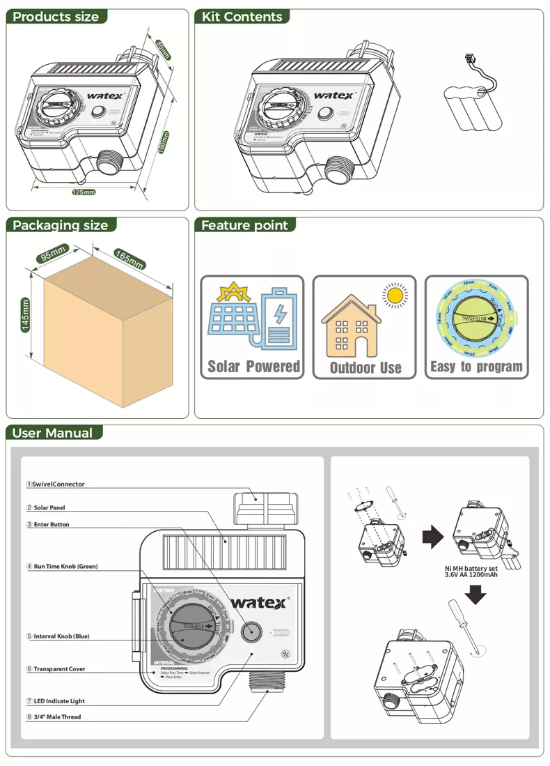 Im Vergleich zu ähnlichen Produkten ist beim solarbetriebenen Wasserhahn-Timer kein häufiger Batteriewechsel erforderlich (bei normalem Gebrauch). Es ist umweltfreundlich und energieeffizient. Es verfügt über ausreichend Leistung und ist langlebig, was es zu einem Bewässerungsgerät macht, mit dem Sie beruhigt geschäftlich unterwegs sein können.