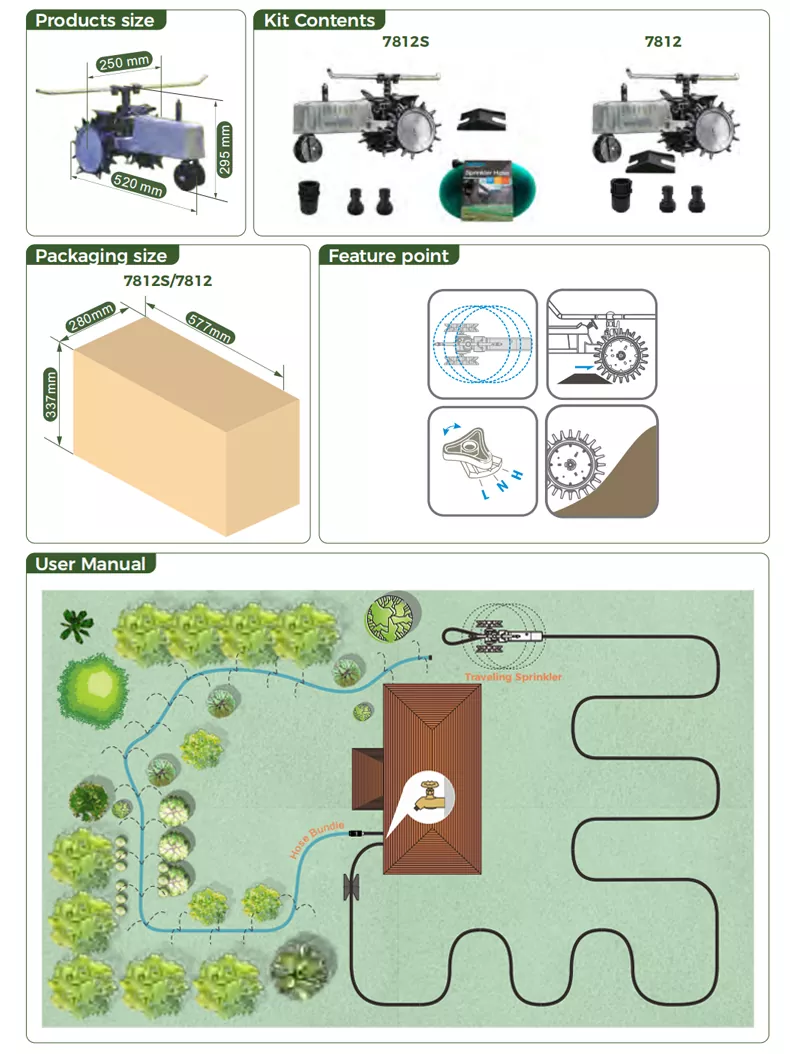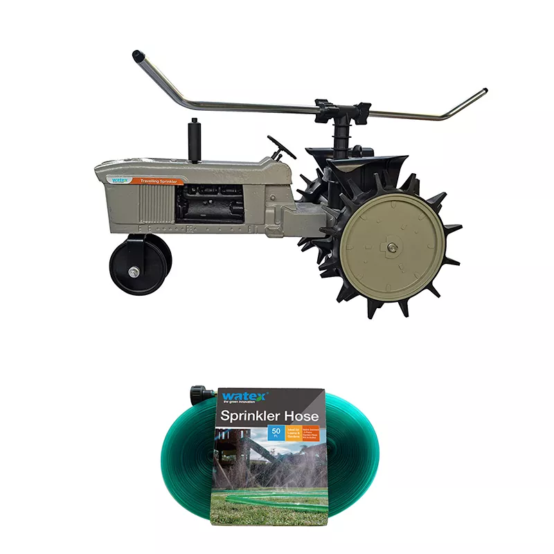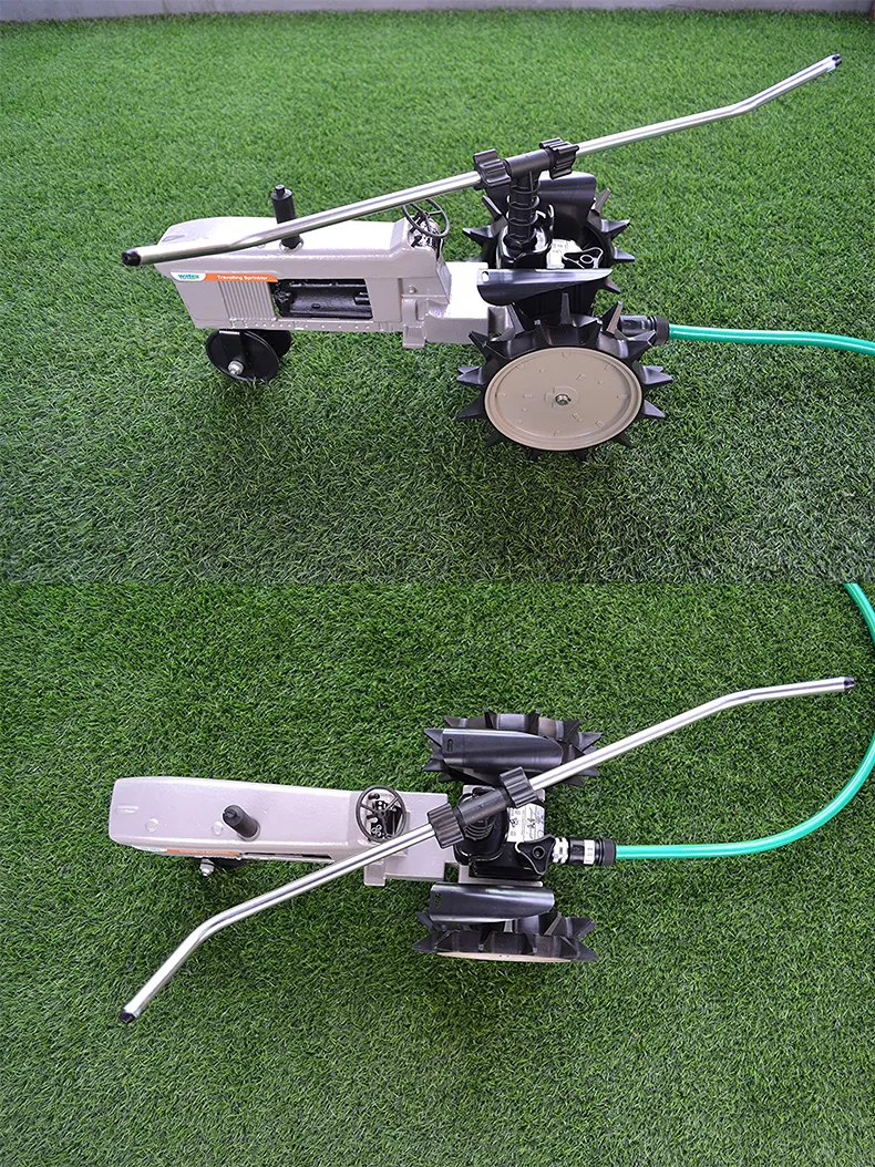Willkommen bei der Entscheidung für den Wandersprinkler von Watex. Dieses Produkt verfügt über ein einzigartiges Design im Traktorstil und ist ein selbstfahrender Wasserwagen, der seine Bewegung durch Wasserdruck antreibt und so eine effiziente Rasenbewässerung ermöglicht.